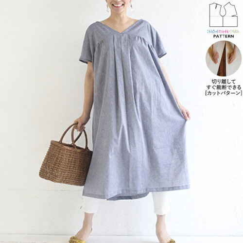 【型紙】 (カット済 パターン)TP041 Vネックギャザーワンピース (FREE) / 縫い代付き・実物大・ピリピリ離してすぐ裁断! ( 型紙 パターン ハンドメイドカンパニー )