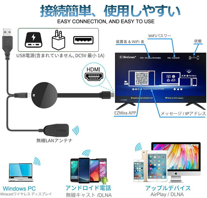 【強大な互換性&HD1080P高解像度】改良したミラーリングはHDMI 1920x1080PフルHD 出力をサポートして, それにEzmira、AirPlay、Miracast、DLNA、など多数の無線マルチタッチプロトコルを互換できます。