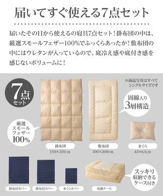 布団セット シングルサイズ【送料無料】厳選フェザー超増量2.0kg!羽根布団7点セット S 羽根掛布団・敷布団・枕・カバー(掛・敷・枕)3点・収納袋