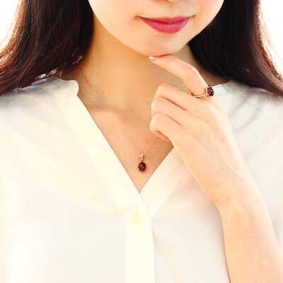 「フェミニンなあなたを引き立てる艶やかさ」 大粒ヘソナイトガーネットを使用した圧倒的な存在感は、あなたも、見る人も虜に・・!デコルテで絶妙な輝きを放つヘソナイトガーネットとバラモチーフが、女性らしさ、美しさを引き立ててくれます。