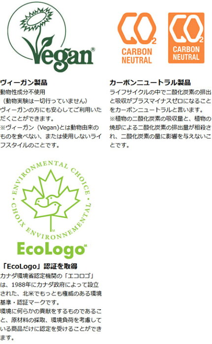 ヴィーガン製品動物性成分不使用(動物実験は一切行っていません)ヴィーガンの方にも安心してご利用いただくことができます。