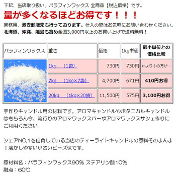 北海道、沖縄、離島も含め全国3,000円以上のお買い上げで送料無料!パラフィンワックス重さ価格1kg単価最小単位との価格比較1kg (1袋)730円730円←より↓の方が…7kg (1kg×7袋)4,700円671円410円お得20kg (1kg×20袋)11,500円575円3,100円お得 ※気温により、かたまりになっている場合があります。