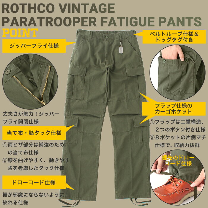 ロスコ カーゴパンツ メンズ ヴィンテージ パラトルーパー ファティーグパンツ ジッパーフライ XS-2XL ROTHCO 20140417 20150116【R】20170427【R】20210507 プレゼント用のギフトラッピングはコチラから ▲ラッピング レギュラー ▲ビッグサイズ ブランド説明 ROTHCO ロスコ 60年以上の歴史を持つアメリカを代表するミリタリーウェアブランド COMBAT TESTED SINCE 1953 ROTHCO1953年にアメリカ東海岸のマンハッタンでMilton Somberg (ミルトン・ソンバーグ)によって設立されたROTHCOは、 創立した当初よりアメリカの陸海軍に ミリタリー製品を供給してきた伝統あるミリタリーウエアブランド。